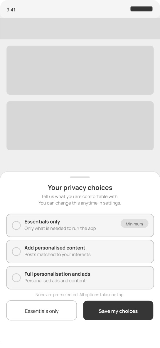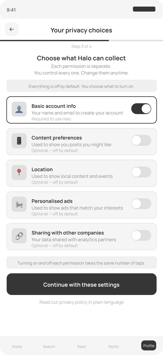 Screen 1 — Onboarding consent flow All permissions are off by default. Each permission is a separate card with a plain language description. Basic account data is the only required permission. Accepting and declining each permission takes the same number of taps. There are no pre checked boxes.
