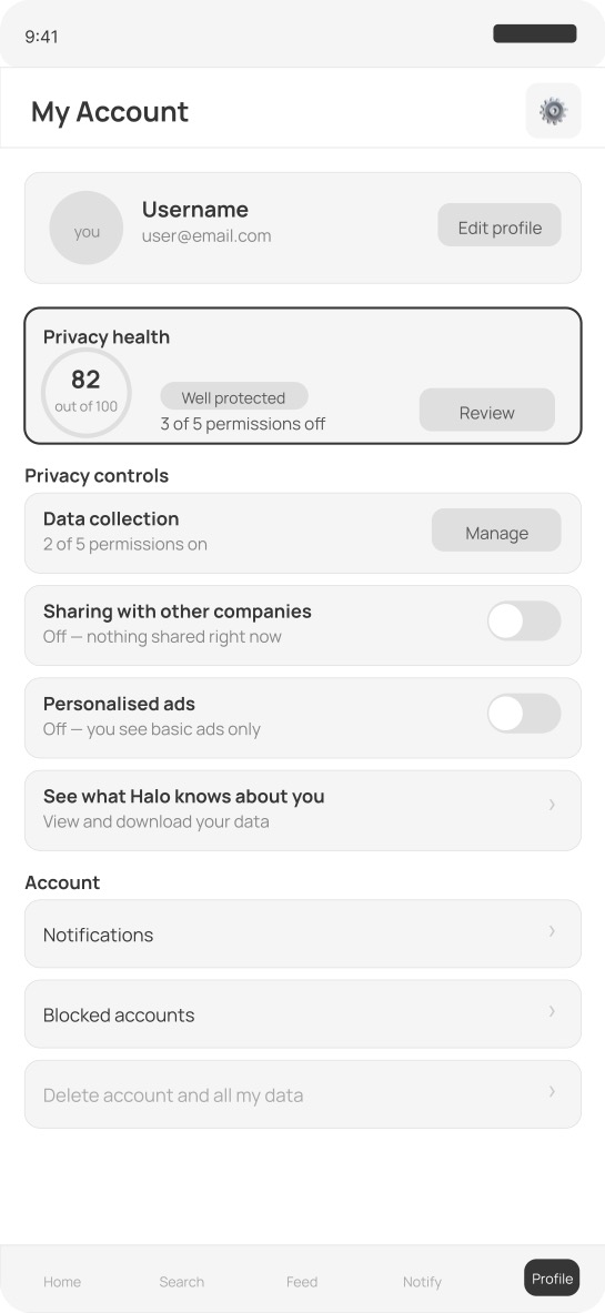 Screen 2 — Privacy settings on the account screen A privacy health score is visible directly on the account screen, not buried in settings. All privacy controls are in one place. Third party sharing and personalised ads are off by default. A data transparency link gives users direct access to everything Halo holds about them.
