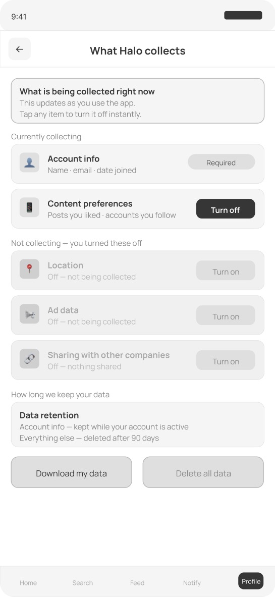 Halo is a fictional social media app designed to show what privacy first design looks like when genuine user consent replaces compliance theater.