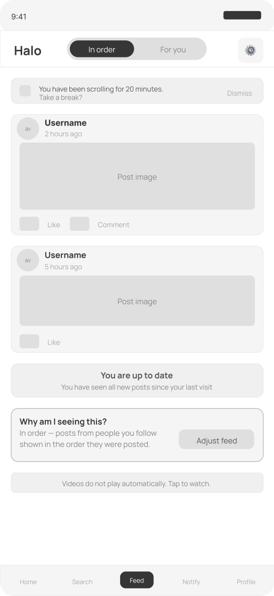 Screen 4 — Feed with algorithm controls Chronological feed is the default. There is no autoplay. A natural stopping point appears when the user has seen all new posts. An algorithm transparency panel explains why posts appear. A wellbeing nudge appears after twenty minutes of continuous scrolling.