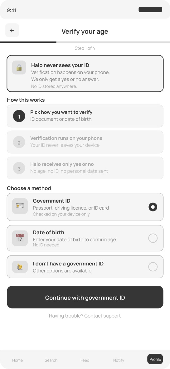 Screen 6 — Age verification flow A prominent privacy promise card appears before any verification begins. Halo never sees the ID. Verification happens on device only. Halo receives only a yes or no result. Three verification method options are available including one for users without government ID.