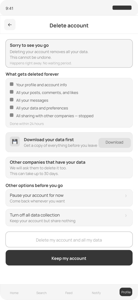 Screen 7 — Account deletion and data removal Delete account is easy to find. A complete list of what gets permanently deleted is shown before the user commits. A download your data option is available before deletion. Third party data deletion is disclosed with a timeline. Two alternatives are offered before the final confirmation. The delete button is less prominent than keep my account but this is honest UX, not a dark pattern in reverse.