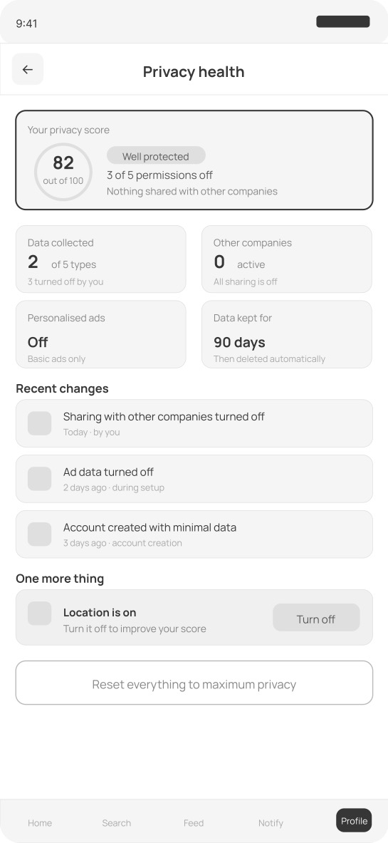 Screen 8 — Privacy health dashboard An overall privacy score with four metric cards shows data collected, third parties active, ad personalisation status, and data retention period at a glance. A recent privacy activity timeline shows every change made and when. A single suggestion for improving the score appears if relevant. A reset to maximum privacy button is always available.