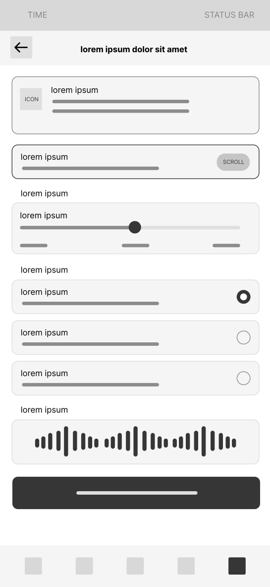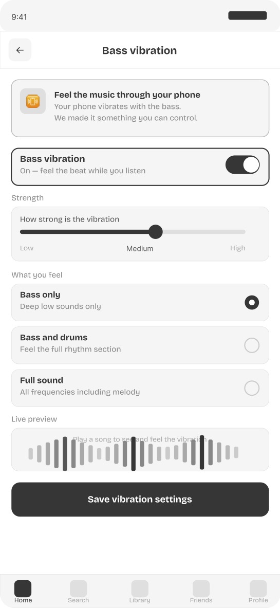 Screen 7 — Bass vibration controls Bass vibration is treated as an intentional designed feature rather than an accidental side effect. Users control intensity from low to high and choose their preferred frequency range. A live waveform preview shows the rhythm visually while the phone vibrates in real time.