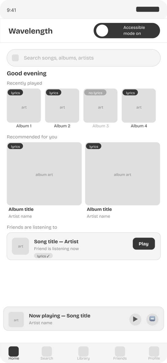 Screen 1 — Home screen with accessibility mode toggle A visible accessibility symbol on the home screen activates full deaf friendly mode in one tap. Every album card shows lyrics availability before the user commits to listening.