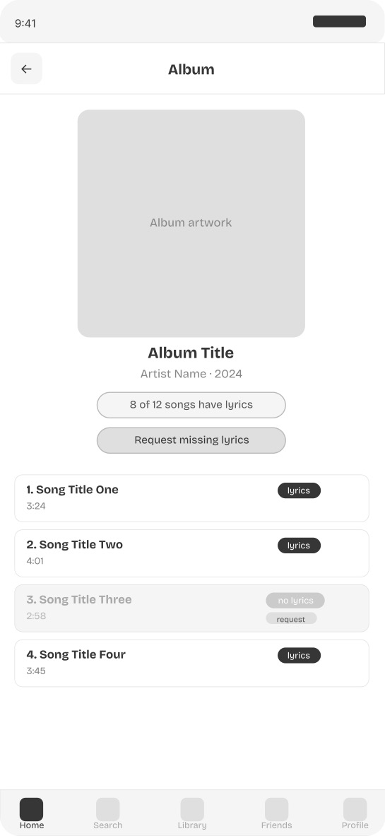 Screen 2 — Album page with lyrics availability badges A lyrics completeness indicator shows how many songs on an album have lyrics before the user plays a single track. Songs without lyrics are visually distinct and include a request option inline.