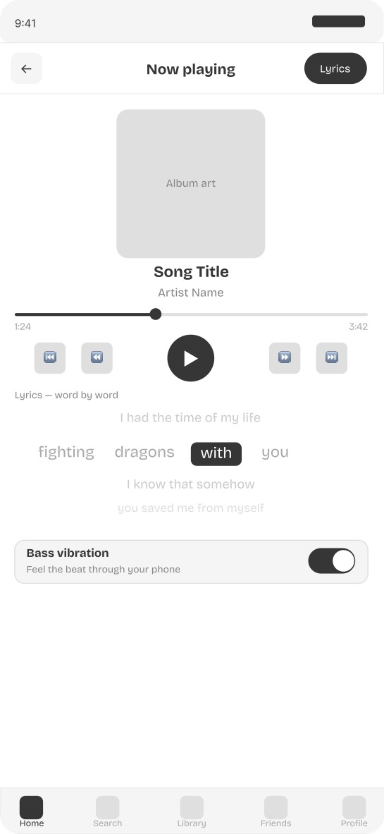 Screen 3 — Now playing with word by word lyrics Each word is highlighted individually in real time as it is sung. Previous lines fade above and upcoming lines appear below. Bass vibration is toggled directly from the now playing screen.