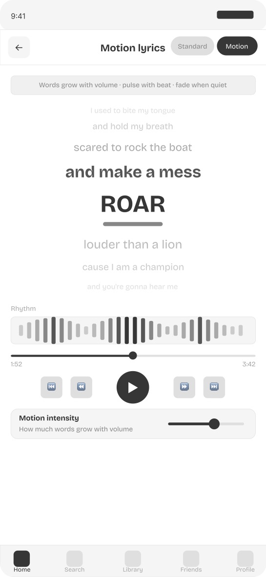 Screen 4 — Motion responsive lyrics view Words grow with volume and pulse with beat. The current word is the largest and darkest element on screen. A visual rhythm waveform shows the beat independently of the lyrics.