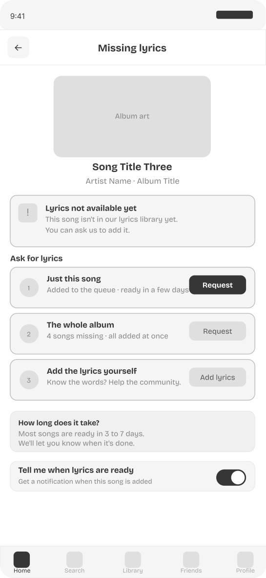 Screen 5 — Missing lyrics request flow Three options are available when lyrics are missing: request this song only, request the entire album at once, or contribute lyrics directly. An estimated timeline and a notify me toggle ensure the user is not left at a dead end.
