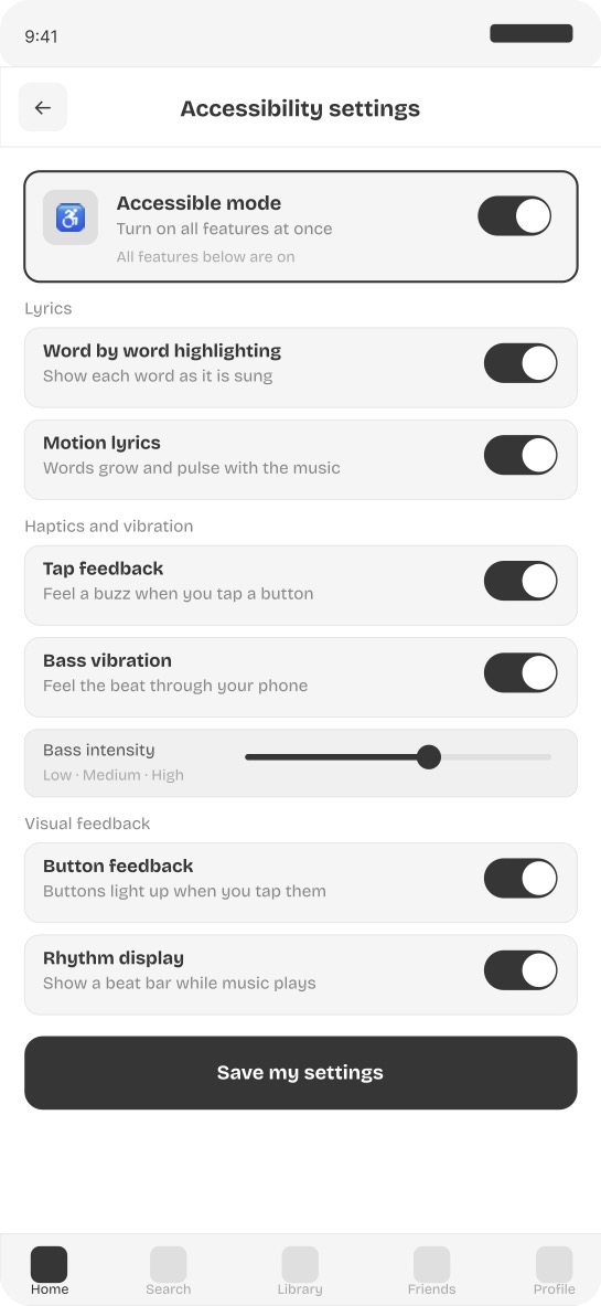 Screen 6 — Accessibility settings panel All accessibility controls are centralized in one panel accessible from the home screen. A master toggle activates everything at once. Individual controls for word by word highlighting, motion lyrics, bass vibration, tap haptics, and visual feedback can each be adjusted separately.