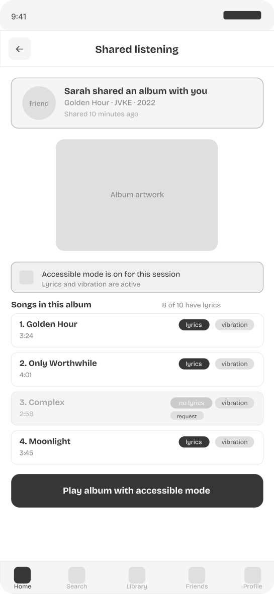 Screen 8 — Shared listening mode When a friend shares an album, the shared listening screen shows accessibility status per song before anything plays. Songs with lyrics show both lyrics and vibration availability. Songs without lyrics show a request option inline. The gap between deaf and hearing listening experiences is made visible and actionable rather than invisible and frustrating.